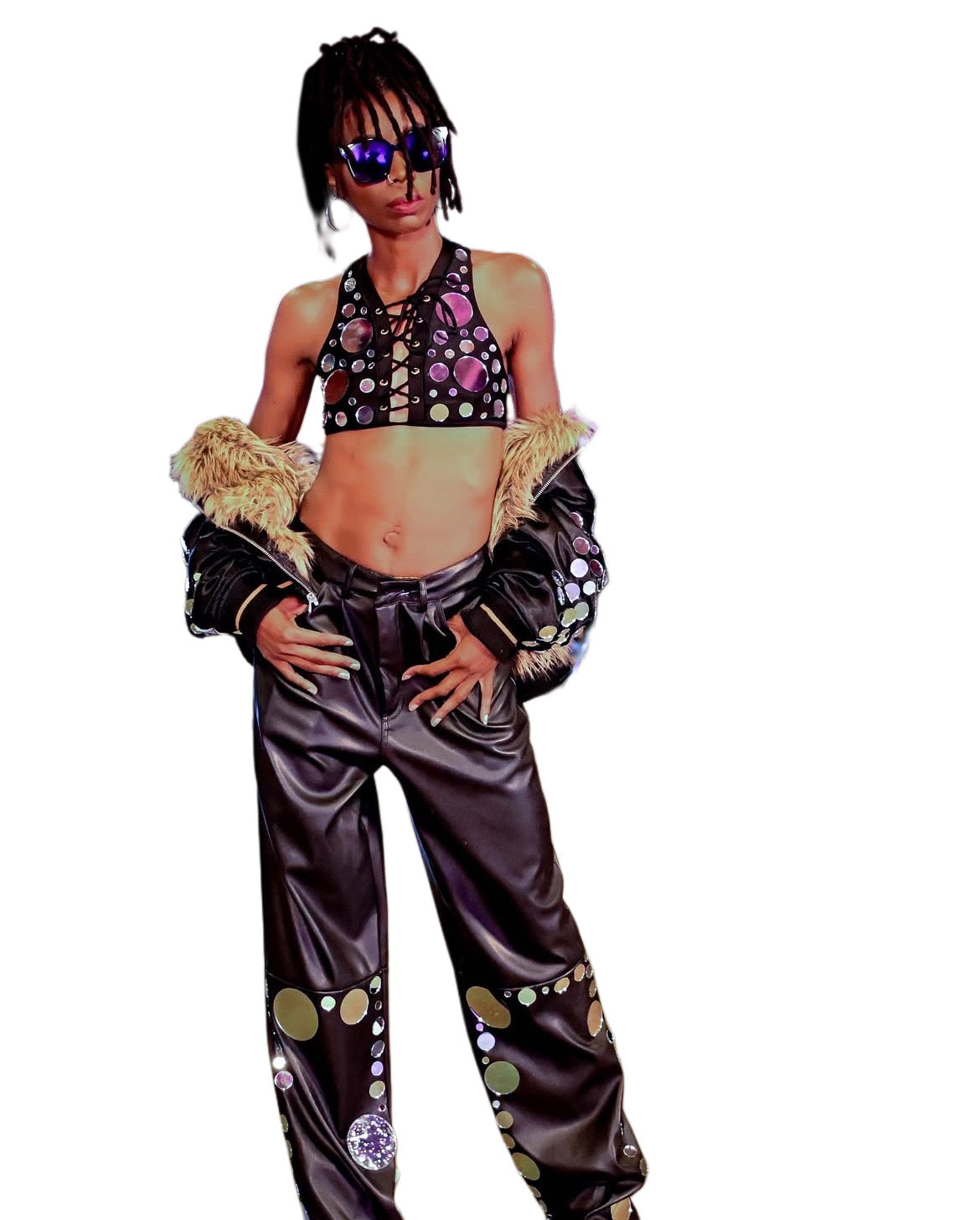 Our Flashy lace up top is a must-have for your wardrobe. Embellished with mirrors, this top adds a splash to any outfit. It's true to size and perfect for making a statement on stage, when you just want to make a statment, or at a special event.
