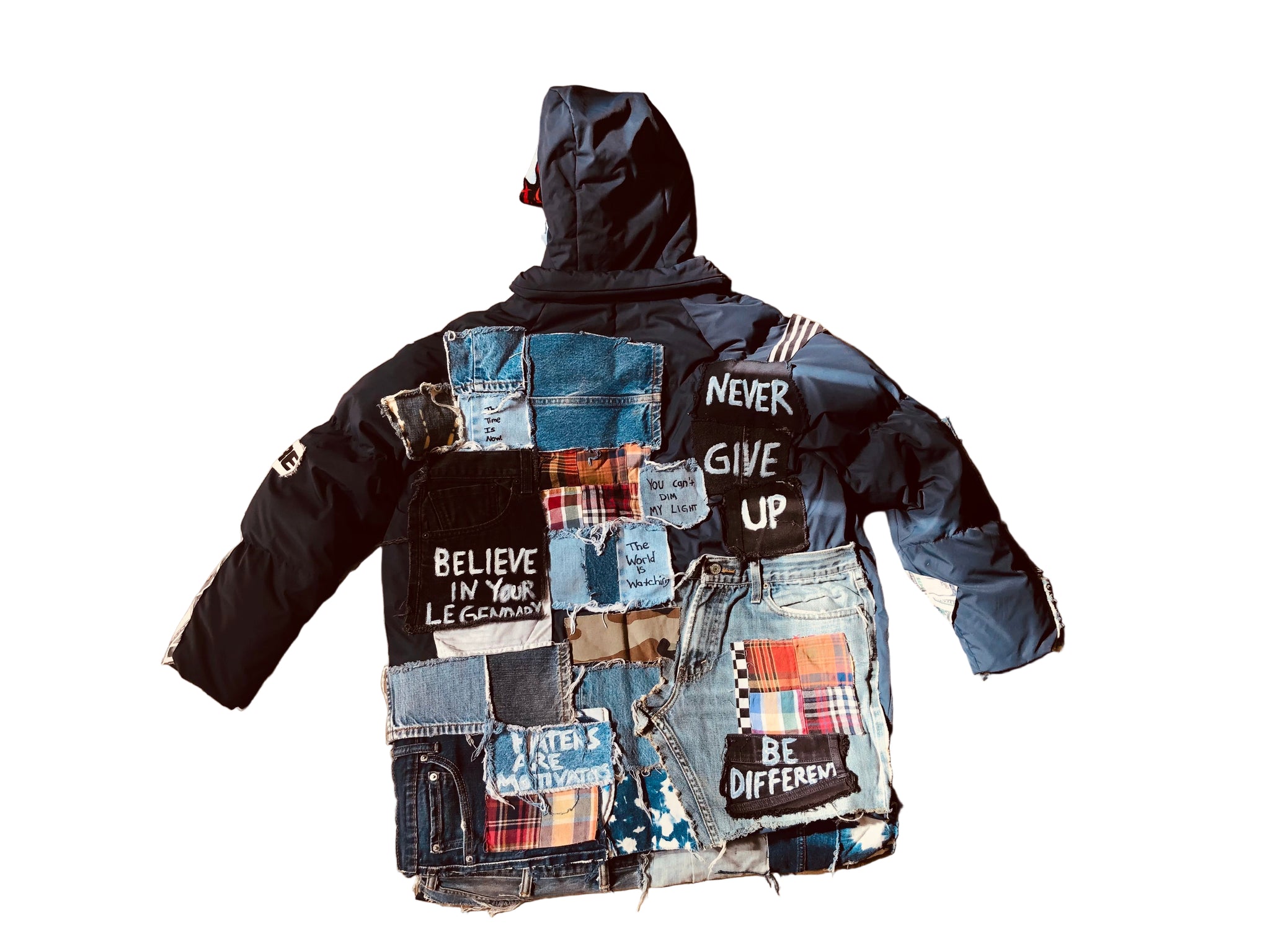 The Never Give Up Patchwork Puffer Coat is built for the relentless — the ones who push forward, take up space, and move through the world with fearless intention. Designed with two full layers of reconstructed puffer fabric, this coat creates a dimensional, sculptural silhouette that stops everything in its path. Upcycled denim, mixed reclaimed textiles, adjustable detailing, and hand-painted patches transform this XL bomber into a wearable battle cry. Unisex. Oversized. Unstoppable.
