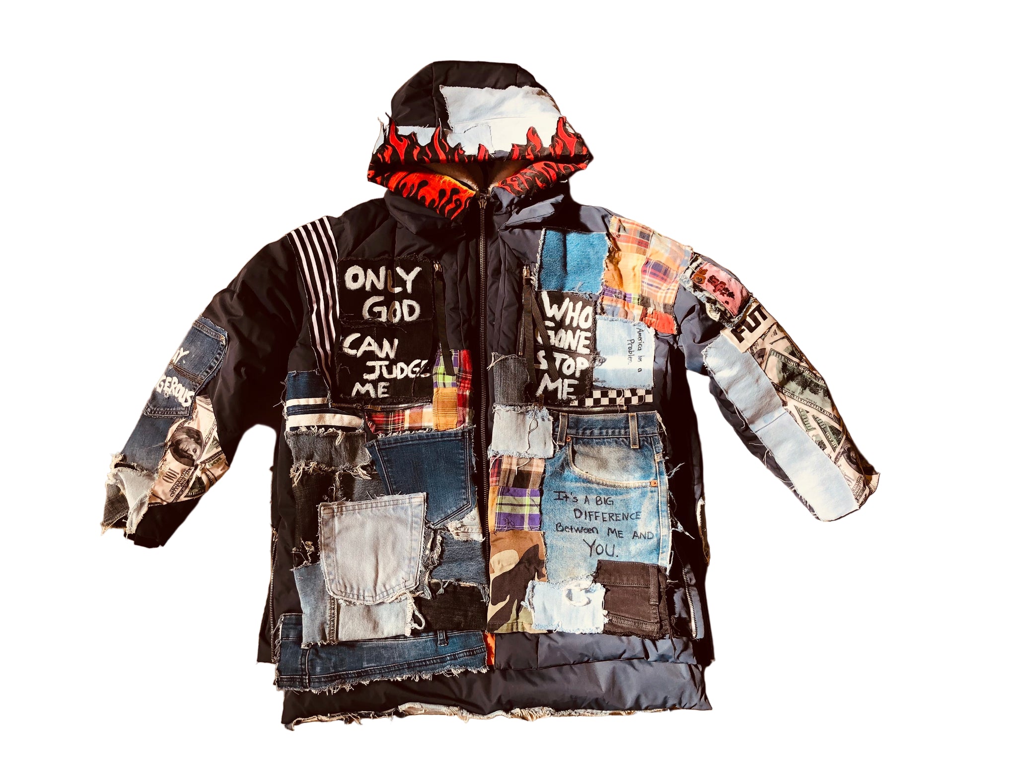Every Never Give Up Patchwork Puffer Coat is individually assembled, hand-detailed, and uniquely engineered. Patchwork layout, painted elements, fabric mix, and layered construction will vary. No two pieces are the same. This is personal armor — custom built for your journey.