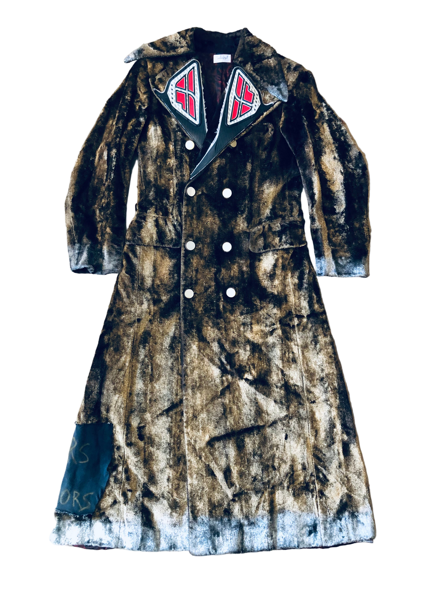 The Unapologetic Trench Coat is a bold, one-of-one statement piece sure to add quite a splash to your wardrobe. Crafted from up-cycled fur and Biker fabrics, this coat is meticulously handcrafted. Hand-painted patches featuring “Making Black History Everyday” and “Haters Are Motivators” add a personal, empowering touch, while up-cycled motorcycle lapels, mirror buttons, and custom gold-and-silver painted details make this coat truly unique.